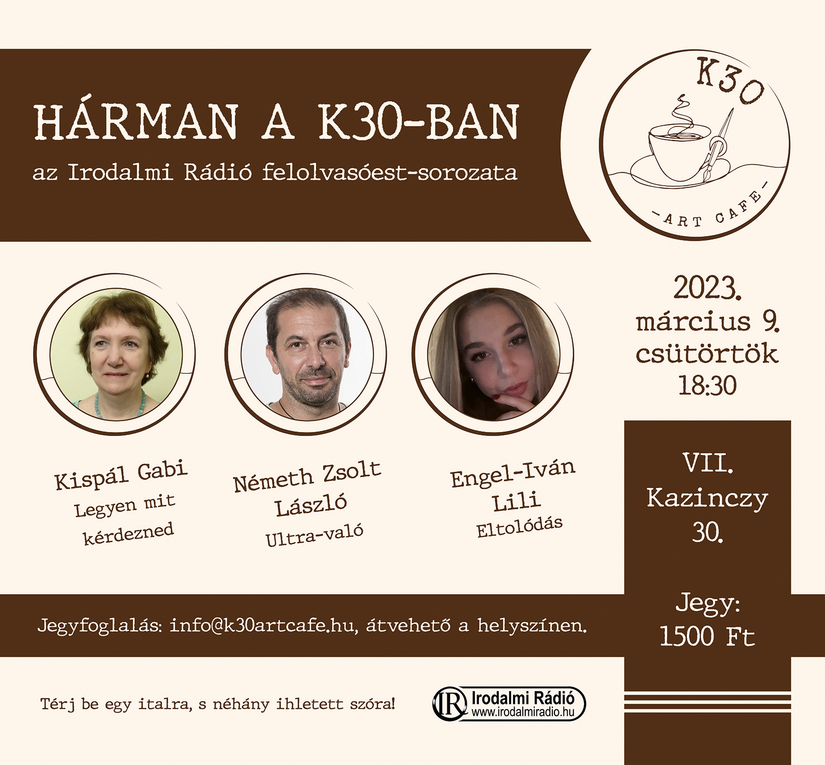 Márciusi első felolvasóestünk három szerzője Kispál Gabi, Engel-Iván Lili és Németh Zsolt László voltak a K30 Art Caféban. A vidám hangulatban zajló esten tréfás történetek és komoly versek is előkerültek.