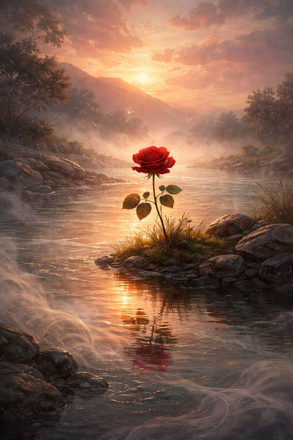 Rózsa nyílik a parton, folyót díszíti tükörképe,