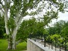 A régi kastélybejárattal átellenben kialakított kávézó a függőkert szimmetriatengelyében nyitható meg a kert felé. A tetőkertből kétoldalt lehet a parkba jutni. A kert dísze a most rekonstruált két tó. A kisebbik, az eredeti tervekben is szereplő látványelem, a nagyobb fontos szerepet kapott a szálló víz háztartásában. Itt keveredik az uszodából elbocsátott használt gyógyvíz, a talajvíz süllyesztésével nyert keverővízzel, hogy azt a patakon át vezessék vissza a természetbe. A kert külön értéke az ország egyik legöregebb platánfája (200 éves), amely az uszodát is rejtő terasz fölé borul hatalmas ágaival. Külön éjszakai díszkivilágítást kapott, hogy az uszoda felülvilágítóiból kiszűrődő fénnyel együtt sejtelmes fénnyel derítse az épület előtti teret.