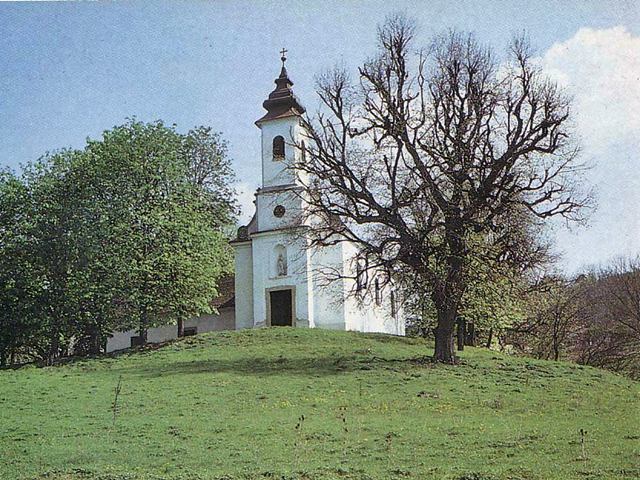 Története a hagyomány szerint már a török hódoltság előtt is búcsújáró hely volt, amelynek szent kútját, remeték őrizték és már a 17. század végén sokan felkeresték. A 18. század elején a környékre németek telepedtek. Ők adtak a csodatevő forrásnak nevet (Bründl-Brünnlein=kutacska). Az első remetét, Szabados Fülöp miskei zarándokot 1731-bői említik. Ő a forrás mellett kis cellát épített magának, kápolnával. A mai csicsói templomot 1745-ben Anton Mercy d'Agentean földbirtokos építtette a Szentháromság és a Segítő Szűz Mária tiszteletére. A kisebb dombon szabadon álló, egyhajós templom, Ny-i homlokzata elé kilépő toronnyal, poligonális záródású szentéllyel, É-i oldalához épült földszintes, felülkontyolt nyeregtetős egykori remetelakkal (1755) és kétszintes, kontyolt nyeregtetős sekrestye-oratóriummal. Tornyát volutás, vázadíszes fél oromzatok fogják közre. A tornyon nyíló, kőkeretes kapu felett kagylódíszes fülke Mária-szoborral. A hajóban csehsüveg boltozat, a szentélyben fél kupola, a Ny-i oldalon csehsüveg boltozatos karzat. A berendezés 18. századi. A templom oltárképe 20. századi, kis jelentőségű munka.
