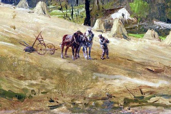 sugárzó festmény a Colpachi szántást ábrázolja. A domboldalon szántó alak