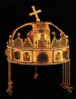 Legszebb emlékünk e korból a magyar királyi korona (szent korona). Tulajdonképpen két részből áll; a felső, zárt korona a kettős kereszttel a hagyomány szerint az a korona, amelyet Szent István kérésére 2. Szilveszter pápa küldött; az alsó, abroncskoronát Dukasz Mihály bizánci császár küldte Géza királynak. A 11-12. századból való korona értékes műkincs. |