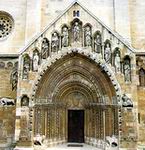 A legszebb magyar románkori oromzatos kapu, a jáki templom nyugati kapuja. A növényi és geometrikus díszítésű kapu oromzatának fülkéiben Krisztus és két oldalán lépcsőzetesen sorakozó apostolok szobrai találhatók. A bélletoszlopokat átfonó növényi indák, a béllet sarkait felbontó geometrikus ornamensek szinte megszüntetik a kapuzaton a nehézkedés törvényeit. Az oromzat fülkéiben Krisztus a két oldalán lépcsőzetesen sorakozó apostolfigurákkal együtt szinte súlytalanul lebeg.