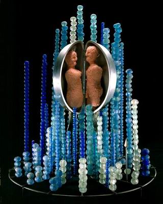 üveggyöngy, szövetanyag és acél (