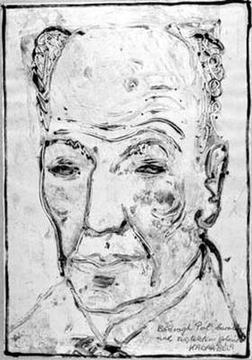 Magas homlokú, fejtetőjén kopasz férfiarc szemből. Szeme keskeny. Arccsontján piros folt. Dedikáció: Bodrogh Pál barátomnak tiszteletem jeléül Kádár Béla