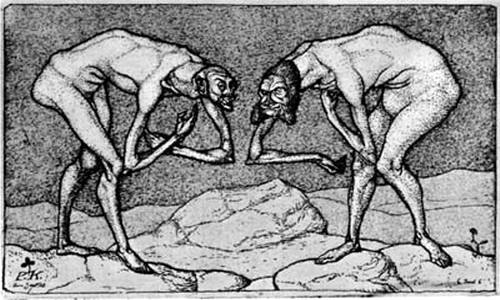 A Michelangelo-karikatúrát szecesszióval kezeli. Egy fanyar, nevetséges állat jelenik meg. A jobb oldali figura Ferenc Józsefet ábrázolja (gogoli hatást mutat) a másik Vilmos herceg. |