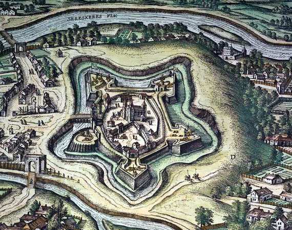A Nagyváradot délről, madártávlatból ábrázoló rézkarc művészettörténeti szempontból legfontosabb részlete a 16. században olaszbástyás rendszerrel kiépített, szabályos ötszög alakú vár. Közepén látható a Szent László és Zsigmond temetkezőhelyeként is szolgáló, mára gyakorlatilag teljesen elpusztult székesegyház, amely a 19. század végi ásatások ellenére alig ismert. A székesegyháztól közvetlenül balra megjelenő, E betűvel jelölt lovas a kép magyarázata alapján a vártól délkeletre látható, vágtázó lovasokkal ellentétben nem valós alakot ábrázol, hanem a Márton és György kolozsvári szobrászok által 1390 körül bronzból öntött Szent László-lovasszobrot. Az 1660-ban elpusztult szobor témája és technikája, illetve a Mártontól és Györgytől fennmaradt egyetlen mű, a ma Prágában látható, a lovas Szent Györgyöt ábrázoló szobor alapján nemcsak a Zsigmond-kori Magyarország, hanem Európa művészetének is meghatározó alkotása lehetett. |