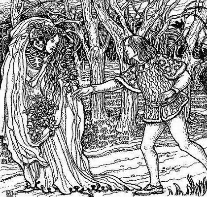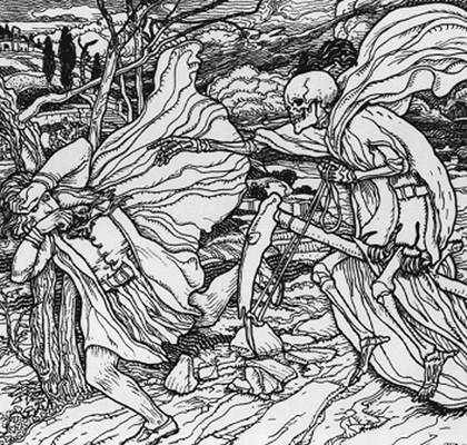 A halál állandó jelenlétét, sokszor csábító alakban való megjelenését mutatja be ez a két rajz. A mondanivalót középkori helyszínre helyező, a halált klasszikus módon csontvázként, csontkaszán lovagolva ábrázoló művész a témának novellisztikus jelleget ad. Az ábrázolás a szecesszió kedvenc módszere, a képek mégis a középkori fametszetek hangulatát idézik. |