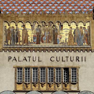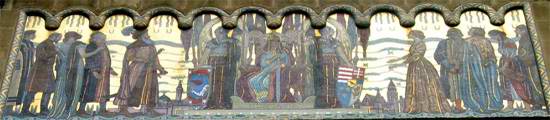 Körösfői Kriesch Aladár legszebb alkotása, mozaik-berakásos kép Róth Miksa műhelyében készült. A széken ülő női alak fején a magyar korona látható, két oldalán egy-egy angyalszárnyas nő áll, kezükkel támasztva Marosvásárhely és Mátyás-király címerét, a háttérben a Városháza és más középületek láthatók, a trónszék pódiumánál előlapján a HUNGARIA felirat olvasható; a trónszéktől jobbra és balra történelmi női és férfi alakok sora áll, a férfiak sorát Bethlen Gábor vezeti. |