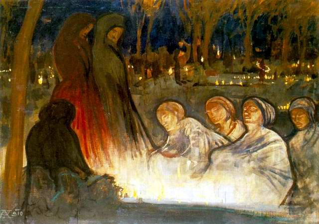 Az emberi lét nagy kérdéseinek, mint születés, szerelem, mulandóság jelképes formában történő megfogalmazása a századforduló kedvelt témái közé tartozott, hiszen a téma nem volt idegen a szecesszió szimbolizmusának melankóliára hajló gondolatvilágától. Nem véletlen, hogy az oly egzakt morális és vallási nézeteket valló Körösfői-Kriesch Aladár is többször nyúlt e tárgykörhöz. Az elmúlás fájdalmára és megmásíthatatlanságára utal a képen álló két alak, míg a sommásan megmintázott, szibillaszerű ülő nőalakok fájdalmukban is az emberi lét örökkévalóságába vetett hitet szimbolizálják. Az két csoport szembeállításával az élet és halál elválaszthatatlanságára utal a művész. A mű mondanivalóját támasztja alá a festmény színvilágának kevés, sötét színre való redukálása, az alakok egy-egy vonallal hangsúlyozott, tömör, sokszor elnagyolt megjelenítése, a világítási effektusok sejtelmessége. |