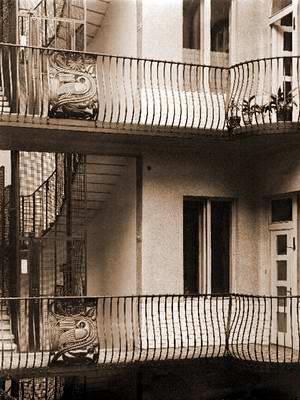 homlokzat és belső folyosó (Budapest, V. Szervita tér 5.)