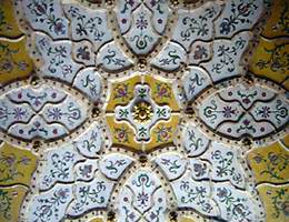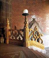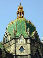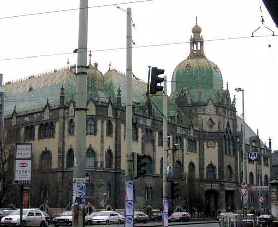 A millenniumi ünnepségekhez kapcsolódva Ferenc József császár avatta fel a Magyar Iparművészeti Múzeum és Iparművészeti iskola épületét, Lechner Ödön nemzeti formanyelv teremtő stíluskísérletének e sokat vitatott, hatásos példáját. Újdonság, hogy az épület egész homlokzatát színes, mázas kerámia borítja. Jelenleg csak a letisztított vagy felújított felületeken élvezhető ennek gazdag színvilága, ragyogása, amelyet Lechner tett nemes, elegáns építőanyaggá. A kupola körül az egész alakos Bocskai-ruhás ifjak (első kiskép) az iparművészet egyes ágait szimbolizálják. A bejárati torony kőhatású burkolatával sajátos ellentétet képez a félig nyitott előcsarnok vörös eozinlemezekkel burkolt fala, és a boltozat hullámos keretű sárga és fehér mezőiben megjelenő hímzések növénymotívumait idéző gazdag, színes virágdíszítés. (3. kiskép) Egyedi formálású, az anyag tulajdonságait, a szabad formálhatóságát érvényre juttató a lépcsők áttört sárga mázas mellvédje (2. kiskép), s az azt lezáró, Lechner formafantáziájából született plasztikus elem. Az egykor itt állt kandeláberek elpusztultak. |