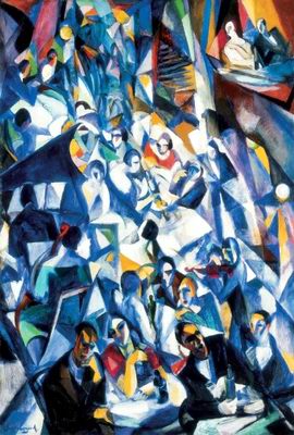 A német expresszionizmus kutatásában már csaknem két évtizede használatos a "Grossstadt-bildern", a nagyváros-festészet fogalma. A műfaj lokális centruma Berlin volt, Európa legfiatalabb metropolisza, mely a húszas években Párizst is felülmúlva a modern művészet fellegvárává vált. A nyüzsgő, dekadens, egyszerre vonzó és taszító, ideges remegéssel átjárt világváros jellegzetes képtípusokon jelent meg. Az utcaképek, városi veduták mellett a metropolisz közösségi terei, a lokálok, kávéházak, színházak vonzották leginkább a művészek fantáziáját. A két világháború közötti magyar festők közül kétségkívül Schönberger az, kinek érett alkotásaiban e tematikus és stiláris párhuzamok a leginkább felfedezhetők. Bár valószínűleg sohasem járt Berlinben, a húszas évek második felében született művei a nagyváros-festészet legszebb magyar példái közé tartoznak. Míg a külvárosi részleteket, kikötőket, magas bérházakkal közrefogott szűk utcákat ábrázoló festményeit általában a kubizmus képalakító eszközeivel formálta meg, addig figurális jelenetein az expresszionizmus stílusjegyei dominálnak. Mint ez a kép is bizonyítja, ezen alkotásait felfokozott, átszellemített színkezelés jellemzi, s az arcokon a német expresszionista képekről jól ismert, maszkszerű, a törzsi művészet hatásáról árulkodó formaalakítás figyelhető meg. A Zenés kávéház egyfajta urbanizált árkádia képként is értelmezhető. Schönberger festményén a mindent átszínező kék alaptónus miközben sajátos tónusegységbe vonja a kompozíciót, némileg megfosztja konkrét jellegétől is, éteri, transzcendens fénybe borítva a nyüzsgő, vibráló jelenetet. A zene dallamaiba vegyülő beszélgetés foszlányait, a poharak koccanását, a lüktető hang és mozgás-kavalkádot kitűnően érzékelteti jellegzetes, kaleidoszkópszerű felület tördelése. Oszcilláló remegés fut végig a kép felszínén, melyet a széttartó vonalak, a szabdalt síkok és a felvillanó színfoltok ismétlődései ritmizálnak. |