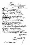 A börtönben visszatért a valláshoz, és ekkor írta a Szövegtelen románcokat (1874). 1875 januárjában az immár hívő katolikus Verlaine-t kiengedték a börtönből, aki az írással is szakított. Rimbaud-t felkereste Stuttgartban. Megpróbálta meggyőzni, hogy kövesse a példáját, írjon Istenről, a bűnbánatról és minden jóra fordul. A vita hamarosan verekedéssé fajult amelyben Verlaine alulmaradt. 1881-ben jelent meg vallásos verseinek gyűjteménye, Jóság címmel. 1883-ban visszatért Párizsba. Erotikus verseit a Párhuzamosan (1889) című könyv tartalmazza. Az 1884-es Elátkozott költők a szimbolistákat mutatja be. Az alkohol rabjaként, nyomorban és betegen halt meg Párizsban. Központi témája az eszményi szép volt, amelyet szenvtelen hangnemben és precíz stílusban próbált meg elérni. Két legismertebb műve közül az egyik, a Költészettan programvers, melyben elutasítja az erőltetett retorikus gondolati lírát, és a zenét részesíti előnyben. Legismertebb verse az Őszi chanson (1864) nem konkrét élményt "mond el" (ez "csak irodalom" lenne), hanem egy nagyon összetett, többértelmű, bonyolult hangulatot, megérzést: az őszhöz, az elmúlás szokványos jelképéhez fűződő impressziót örökít meg. Megszólal a dalban a haláltól való félelem, de az elmúlás óhajtása is, a beletörődés a "sok tűnt kéj" után a végleges eltűnésbe. A haldokló természettel együtt haldoklik már az emberi lélek, de a pusztulás rettenetét szelíd melankóliába oldja, enyhíti a költemény zenéje, a szavak és főleg a hangok elbűvölő muzsikája. |
