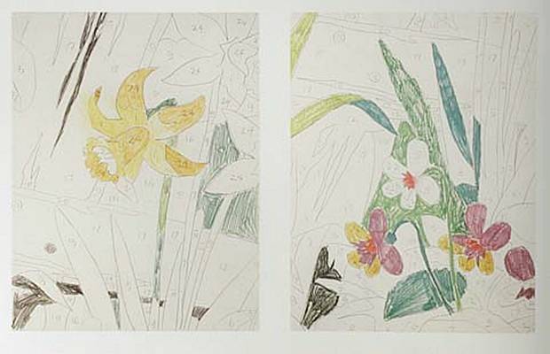 Azt a pillanatot jeleníti meg a művész fejlődésében, amikor az éppen technikát váltott. Nagyméretű, csak részben befejezett vázlat ez, amelyet a műkedvelő festő is befejezhet, ha követi a hiányzó színek számozását. A vázlat kompozíciója sematikus, a hiányzó színek pedig egy ipari kultúra szabványszínei. A mintázat látszólag magas fokú mívességről tanúskodik, pedig csak több ezer azonos példány egyike. Ha a műkedvelő festők mindegyike aprólékosan követné a számokban kifejeződő utasításokat, munkájuk eredménye puszta ránézésre megkülönböztethetetlen lenne egymástól. Gyakorlatilag azonos eredeti példányok ezrei! Warhol egyszerűen megfordította a műkedvelők számára készülő előrajzolási minta bizarr elvét, és a tömegtermelés technikáinak igénybevételével olyan képek sorozatát állította elő, amelyek - különösen e módszer jóvoltából - igenis megkülönböztethetők egymástól, jóllehet csak színárnyalataikban, és ilyenformán nemcsak hogy megkérdőjelezik az "eredeti" műalkotás egyedülállóságát, de még nyernek is az eredeti megismétlésének révén. A Csináld magad (Virágok) tehát éppoly egyedi, mint bármely más festmény, hiszen nincs még egy azonos példány belőle. |