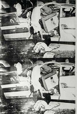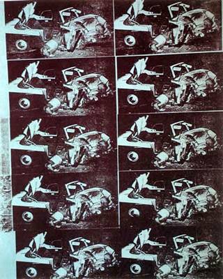 Ha rendkívüli vargabetűkkel is, Warhol a társadalom hihetetlenül pontos ábrázolója volt. Nem tényeket ábrázolt - azokat úgyis mindenki ismeri -, hanem a tények által eltakart "belvilágot": a kollektív sóvárgások és rettegések belvilágát. Csak ritkán szerepelnek személyek Warhol halálsorozatának képein: a fiatal nő, aki leugrott az Empire State Building tetejéről (ahogy mások holmi költekezési orgiába vetik magukat), vagy az ételmérgezésben meghalt asszonyok, akik mérgezett tonhal-konzervet ettek. Még itt is megleli az ember a kapcsolatot a fogyasztás aktusa és a halál között. Legtöbbször azonban "személytelen" marad a halál. Warhol azt nyilatkozta, hogy halálsorozata két részből áll. Az első híres halottakat örökít meg, a második pedig olyan embereket, akikről senki sem hallott. Lehet, hogy ma egy Cadillac a gazdagság és a boldogság jelképe, ám holnapra talán ócskavas-kupac, a halandóság intő jele. Csupán röviddel halála előtt kezdett Warhol ép gépkocsikat festeni. Addig a képein megjelenő autók mindig az erőszakos, értelmetlen, brutális közúti balesetek szimbólumai voltak. A művész újságfotókat használt fel, amelyek annak idején csípős borzadállyal fűszerezték a halálesetekről szóló, minden szenvedélytől mentes beszámolókat. |