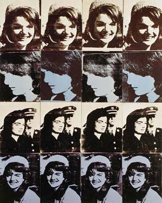 Jackie amint síró arccal áll meggyilkolt férje, John F. Kennedy koporsója mellett: Ezek a sajtófotók talán a merényletnél is jobban megrázták a médiák világát. Andy Warhol több változatban is felhasználta őket, több különböző fotóból gazdálkodva. |