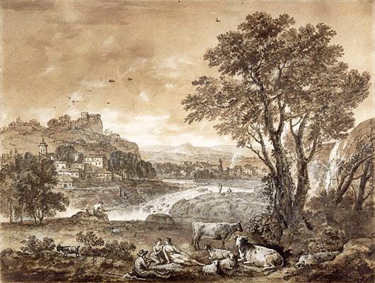 Táj pihenő pásztorokkal, fával és vízeséssel
