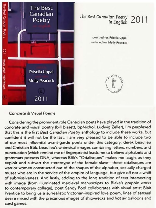 megjelent antológia (nagyítható kisképen kötetborító és angol nyelvű előszó) egyik fejezetéből (The Best Canadian Poetry 2011 -