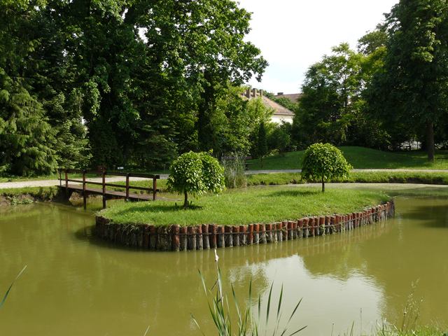 A régi kastélybejárattal átellenben kialakított kávézó a függőkert szimmetriatengelyében nyitható meg a kert felé. A tetőkertből kétoldalt lehet a parkba jutni. A kert dísze a most rekonstruált két tó. A kisebbik, az eredeti tervekben is szereplő látványelem, a nagyobb fontos szerepet kapott a szálló víz háztartásában. Itt keveredik az uszodából elbocsátott használt gyógyvíz, a talajvíz süllyesztésével nyert keverővízzel, hogy azt a patakon át vezessék vissza a természetbe. A kert külön értéke az ország egyik legöregebb platánfája (200 éves), amely az uszodát is rejtő terasz fölé borul hatalmas ágaival. Külön éjszakai díszkivilágítást kapott, hogy az uszoda felülvilágítóiból kiszűrődő fénnyel együtt sejtelmes fénnyel derítse az épület előtti teret.