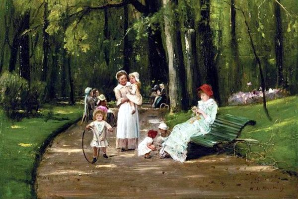 csoportba rendezett figurák jennek meg (előtérben anya a padon, dajka és a