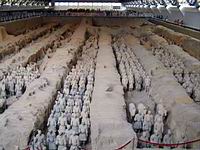1974 tavaszán kútásó parasztok Lintung körzeti székhely környékén, a Li hegytől északra emelkedő (mindössze 43 m magas) sírhalomtól mintegy kilométernyi távolságra hatalmas, életnagyságú figurát találtak a földben. A Senhszi tartományi régészeti intézet, amely az onnan 35 km-re lévő tartományi székhelyen, Hszian városában működik, azonnal kutató ásást kezdett a véletlen lelet helyén és környékén. Páratlan fölfedezés hírét tették közzé: megtalálták az Első Császár monumentális föld alatti mauzóleumának egy részét, benne mintegy 8000 életnagyságú cserépszoborral - katonák, szolgák, lovak, kocsik -, továbbá valódi fegyverek és más tárgyak töredékeivel.