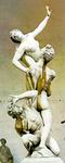 Giambologna: Szabin nők elrablása A merészen dinamikus egyensúlyú márványalakok csoportján ugyanaz a stilizált harmónia érvényesül, ami a Mercuriust is jellemzi. A három emberalak lenyűgöző spirális mozgással szökken a magasba, mintha ellenállhatatlan erő ragadná a végtelen felé. Márvány még sohasem tört így a fantázia birodalma felé. Ez a költői mozgású, merészen kígyózó spirál már a barokk művészet előhírnöke. A szobor a római mitológiából meríti a témát. Eszerint Rómában a bemenekülteknek köszönhetően aránytalanul megnőtt a férfiak száma. Romulus úgy szerzett asszonyokat a férfiak számára, hogy ünnepi játékokat szervezett, s erre meghívta a szabinokat, az őshonos törzset. A családostul érkezett vendégek közül elragadták a lányokat. Az emiatt megindult háború a hagyomány szerint úgy ért végett, hogy a szabin nők közbenjártak - a már közben megszeretett - férjeik érdekében. |
