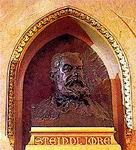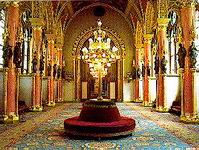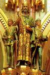 A főlépcső baloldali márvány falán kapott helyet 1904-ben Steindl Imre bronz mellszobra, Stróbl Alajos munkája. A lépcsőre lepillantó, koronázási jelvényeket tartó apródfigurák horgany öntvényből készültek, kissé erőltetetten idézve a festett gótikus faszobrok modorát. A kupolacsarnokban körbepillantva tizenhat uralkodó szobra és címerpajzsa ad rövid történelmi leckét - mind ezeréves históriánkból, mind a dualizmus korának történelemszemléletéből - a pillérkötegekben gyönyörködőknek. Szemben a főlépcsővel Árpád nyitja a sort, majd - balról jobbra haladva - Szent István, Szent László, Könyves Kálmán, II. András, IV. Béla, Nagy Lajos, Hunyadi János és Hunyadi Mátyás következik; azután az erdélyi fejedelmek közül Báthori István, Bocskai István, Bethlen Gábor és I. Rákóczi György; végül pedig három Habsburg: lll. Károly, Mária Terézia és II. Lipót zárja e jócskán kompromisszumos összetételű szoborgalériát.