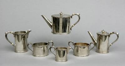 ezüst (magántulajdon) Készlet tartalma: egy egyedi teáskanna, egy kávéskanna, egy vizes kancsó, egy tejszíntartó és két dupla fülű cukortartó - osztrák védjeggyel ellátva.