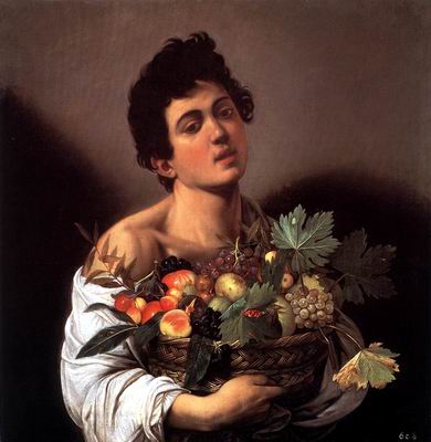 gyümölcskosarat tartó fiú