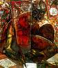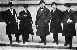 A futuristák - Párizs, 1912 (Luigi Russola, Carlo Carra, F.T.Marinetti, Umberto Boccioni, Gino Severini.) Később, a mozgás már nincs felbontva, hanem szintetizálva, illetve összefoglalva jelentkezik, és a drámai kifejezést szolgálja. (Pl.: Az anarchista Galli temetése című kompozíció). Carlo Carrá, akit de Chiricóval való találkozása 1917-ben a metafizikus festészet útjára térített, az idő és a tér "mágiáját" igyekezett érzékeltetni új képein; viaszbabákhoz vagy fabábukhoz hasonlító figurákat, valamint tárgyakat ábrázolt, amelyeket gondosan megfestett térbeli tömegek közé zárt be. Forrás: Új Magyar Lexikon |