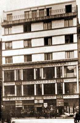 A ház konstrukcióban, a homlokzat tagolásában szintén az egyszerűség, a legszükségesebbre utalás elvét szolgálja, de ornamentika dolgában feltűnően színes és hangos motívumokat szólaltat meg. Bizonyos, hogy az ötlet a ház rendeltetéséből való: az üzleti háznak fel kell tűnnie, önmagában is reklámot kell jelentenie. Csak a megoldás felől lehetne vitatkozni. A Zsolnay-féle pirrogránit szép és színben tartós anyag; de ezek az egyiptomi vagy asszír eredetűnek ható, tulajdonképpen pedig a művész dél magyarországi gyűjtéséből való népmotívumok túlontúl hangosak, nagyon is megbontják a nagyvárosi utca tónusának parancsoló szürkeségét. A legszebben öltözött matyó lányok sem mehetnek végig a váci-utcai korzón kihívó disszonancia nélkül; és kétségtelen is, hogy nem oda valók. Várható azonban, hogy ez az ornamentika később, kissé beleszürkül az utcába; különben sem olyannak sikerült, ahogyan a tervező a szín és anyag együtthatását elképzelte. Sok vitát és ellenvéleményt hívott ki a szervitatéri üzletház. |