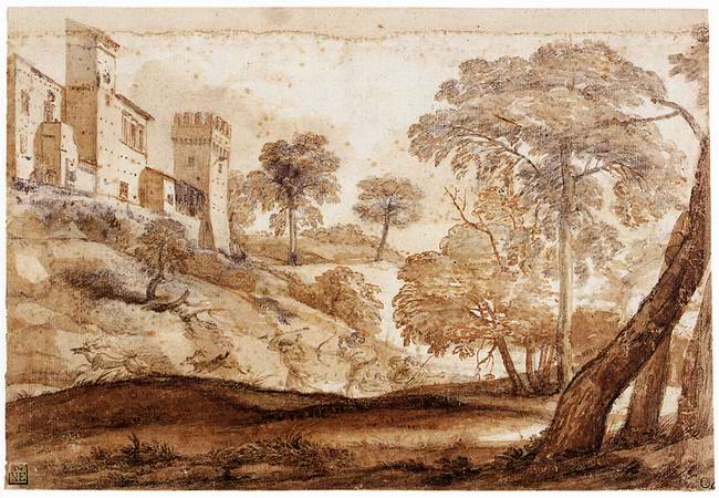 Claude Lorrain klasszikus, ideális tájképeit létező és képzeletbeli elemekből szerkesztette, többnyire úgy, hogy a kompozíciót egy, esetleg két oldalról architektúrával határolta, a középtérben pedig hatalmas fákkal tagolta a képsíkot. A bibliai vagy mitológiai emberalakok mindig alárendelt szerepet játszanak, nem többek, mint báb-figurák. Ennek a rajzának a bal oldalát a Rómától északra álló La Crescenza-kastély zárja le, amely több festményén, így a budapestin is szerepel (vö. 110. számú kép). A rajz a nőalakok klasszikus ruhája alapján Dianát, a vadászat istennőjét és kísérőit ábrázolja. |