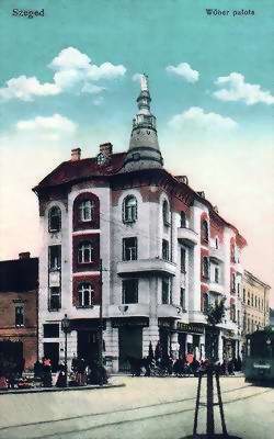 A háromemeletes palota 1913-ban készült el Magyar Ede tervei alapján. A Kiss Ernő utca sarkán álló épület a szegedi szecesszió egy visszafogott alkotása. Az előreugró zárt és nyitott erkélyek váltakozása a nyers tégla vörösének és a fal fehérjének kontrasztja dinamikát ad az épületnek. Az alig díszített saroktorony hangsúlyt ad a sarki épületnek. |