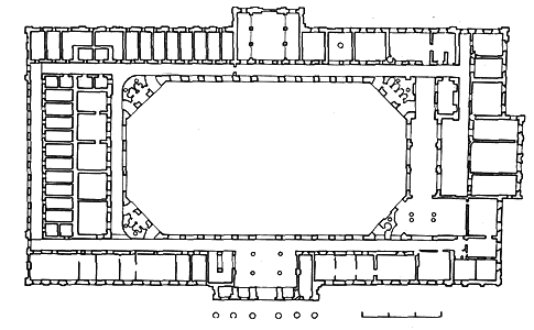 A régi vár helyén megmaradt szintkülönbségek csak kis mértékben okoztak gondot tervezőjének. A kor elvárása szerint és a párkányzatok érvényesülése végett, a lejtő adta nehézség nem jár az épület tömegének mozgatásával, helyette a szintszámot növelték meg. Az épület déli szárnyánál alagsori szint csatlakozott a jellemzően kétszintes épülethomlokzat alá. A nagy kiterjedésű, belső udvaros épülettömb bemutatott minden építészeti bravúrt, amit az akkor már sikeres és ismert Pollacktól el lehetett várni. Alaprajza, funkcionális elrendezése, több esetben indokolta a homlokzatalakítást és a tömegformálást. A reprezentatív, nagy tereket itt is sikerült a középső rizalitok mögé szerveznie. Ezek a gazdagon megfogalmazott épületrészek a három homlokzati oldalon kiegyensúlyozott látványt eredményeztek. Az egyensúlyhoz a finom részletképzéssel megformált sarokrizalitok is hozzájárultak. Ez az épület már nem "egy homlokzatos", mint ahogyan több Pollack-háznál látjuk. A körbejárás során folyamatosan érvényesülő, azonos megoldásokkal találkozunk. |