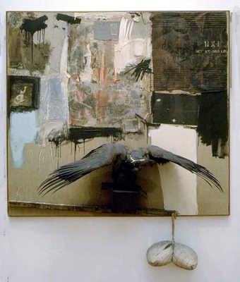olaj, ceruza papír, fénykép, szövet, fa, gombok, tükör, kitömött sas (Baltimor, Museum of Art)