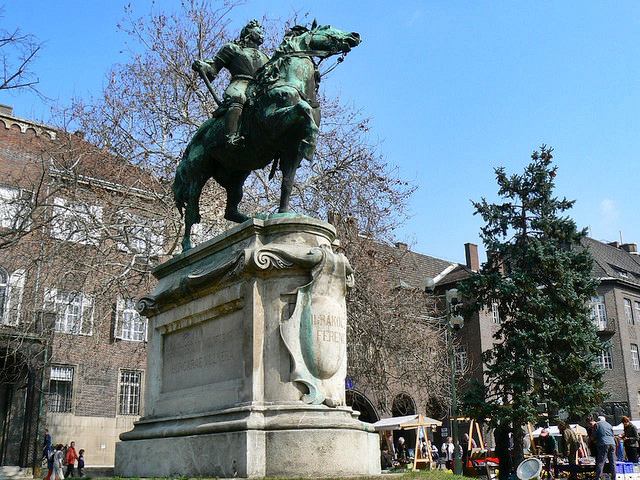 A szobor eredetijét, a Kolozsvári-testvérek (Kolozsvári Márton, Kolozsvári György) 1373-ban készült művét, a Prágai Nemzeti Galéria udvarán őrzik. Több másolata ismert, Prágában (a Hradzsin udvarában), Kolozsvárt, Budapest (az Epreskertben, a Vársétányon), Krakkóban. Ez a bronz másolat, feles életnagyságú, talapzata mészkő - amit 1930-ban állították fel a piarista gimnázium és a kémiai intézet közé. A szobor felállítása csak nyolc évvel később történt. Klebelsberg Kunó ajándékaként került Szegedre. A Rerrich téri Béke épület építésekor lebontották és a múzeum lépcsőházában tárolták. A mai helyére 1959-ben került, 1997-ben új, barokkos talapzatra helyezték.