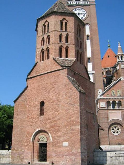 A város magja a 19. századig a Palánk, közelebbről a Templom tér, a mai Dóm tér volt. A három utca határolta szabálytalan háromszög alakú Templom tér közepén emelkedett a belvárosi templom - a Dömötör-templom (jobbra kisképen). Zsigmond király idejében már a harmadik templom állott ezen a helyen, mely 1725 és 1749 között épült újjá. A szokásnak megfelelően temető volt körülötte egészen a 18. század közepéig. A román alapokon álló kora gótikus Dömötör-torony Szeged legidősebb, 11. század alapokon nyugvó építménye, a Szent Demeter-templom egyetlen meghagyott tornya. A templom első említése 1199-ből származik, a 18. századra nyerte el végső formáját. 1709-ben még hat ablaksora (emelete) volt. Még a nagy árvíz is megkímélte a Palánkot. Így maradt meg épségben a régi barokk templom. Amit az áradás meghagyott, eltüntették a szegediek: fogadalmat tettek, hogy az újjáépítés, valamint a jövendő árvizektől való megmenekülés reményében templomot építenek az isteni oltalom és segítség megtartására. S ez az ígéret okozta régi Dömötör-templom végzetét: a törvényhatóság 1883-ban úgy döntött, hogy éppen a régi templom helyén építsék föl az újat. Az építkezés az első világháború kitörése miatt elhúzódott, így a régi templomot csak 1925-ben bontották le teljesen. Ekkor került elő egyik tornyából a Dömötör-torony. Alapfala 11. századi, alsó négyszögletes román stílusú része 12. századi, felső, nyolcszögletű része a 13. századból való. A tornyot már bontani kezdték, amikor Cs. Sebestyén Károly és Móra Ferenc megakadályozta ezt. 1926-ban a Dömötör tornyot az eredeti téglákból helyreállították. A restaurált toronyba Rerrich Béla, a Dóm tér tervezője vágatott bejáratot. Ekkor helyezték el a bejárat fölé (román kori kövek társaságában) Szeged legrégibb szobrászati emlékét, a híres kőbárányt (Szegedi kőbárány - Isten báránya - Agnus Dei, 1200), amely 1719 óta a város címerében is szerepel. A 12. századi dombormű valószínűleg a vár első templomát díszítette. A török újjáépítés után a kőbárány az egyik körbástyára került, s ott nem is háborgatták, egészen a vár lebontásáig. A múzeum kőtárából emelték ki, s tették át méltó helyére, a Dömötör-torony kis kapuja fölé. A kapubéllet egyes 12. századi sakktáblamintás faragott kövei ugyancsak a várbontásból származnak. A ma látható kőbárány másolat: az eredetit ismét a múzeumban őrzik. Bent keresztelőmedencét állítottak föl (Weichinger Károly műve). 1931-ben a Dömötör tornyot felújították, és - olasz mintára - keresztelőkápolnává alakították. A kápolna belsejét Aba-Novák Vilmos falfestményei díszítik, amelyekkel a művész 1932-ben aranyérmet nyert a páduai egyházművészeti kiállításon. Sajnos, a falfestmények már az elkészülést követő évben átnedvesedtek, Aba-Novák Vilmos pedig ingyen újrafestette őket egy kötényfalra. A vizesedő falak miatt végveszélybe került freskókat több technológiával próbálták kiszárítani. A torony falán emléktábla áll, amely az eredeti Dömötör-templomból maradt meg. A tábla a török elleni harc szegedi tábornoka, Bajalich Ádám családi sírboltjának állít emléket. A toronyba, a tér szintjén vágott kovácsoltvas vasajtó - "az élet kapuja" amely a keresztény liturgia jelképeivel az emberi élet egyes mozzanatait mutatja be, ezt az ajtót is Rerrich Béla tervezte. A kapun található két évszám fontos dátumok a torony életében: 1272 a keletkezésének idejére utal, 1931 pedig a helyreállítás évére. A torony gyakran képezi részét a Szegedi Szabadtéri Játékok díszleteinek.
