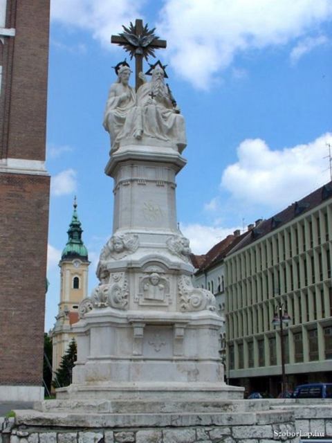 A Széchenyi téren egykor állott, s 1873-ban lebontott Szentháromság szobor helyett 1896. szeptember 6-án szentelte föl Dessewffy Sándor csanádi püspök, a hívők adományaiból Köllő Miklós alkotását. Eredetileg a Dömötör-templom előtt állt; 1940-ben helyezték át a mai helyére. (Az addig ott elhelyezett Mária oszlopot lebontották és néhány héttel később fölállították a Szent György téren. 1940-ben helyezték a mai helyére.) A Szabadtéri Játékok színpadának építésekor a talapzat egy része föld alá került, ami károsan befolyásolja a kompozíció arányait. Stílusával az akkor még megvolt barokk Dömötör-templomhoz igazodott. A 7 m magas, homokkőből készült szoborcsoportot terméskő alapzatra állított, tagolt alapzatra helyezték. Az alapzat alsó részén, az oszlopszékekkel erősített sarkokon csigavonalas díszítő tagok láthatók, közöttük körszeletekből alkotott, lapos ívű párkány alatt domborművekkel. Fölső részén dekoratív mintaként a római számokkal írt állítási évszám, fölötte három függőleges vájattal ellátott téglalap. Az alapzaton két ülő alak az Atyát és a Fiút ábrázolja, közöttük kereszten galamb képében a Szentlélek. A kilencvenes évekre már rossz állapotba került szobrot restaurálták. 1995-1999 között a rekonstrukciót Bánvölgyi László szobrászművész, restaurátor végezte csapatával, így ma már eredeti szépségében látható (balra a kisképen a szobor átépítés előtt - kattintásra nagy mai kép a Szentháromság szoborról).