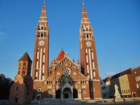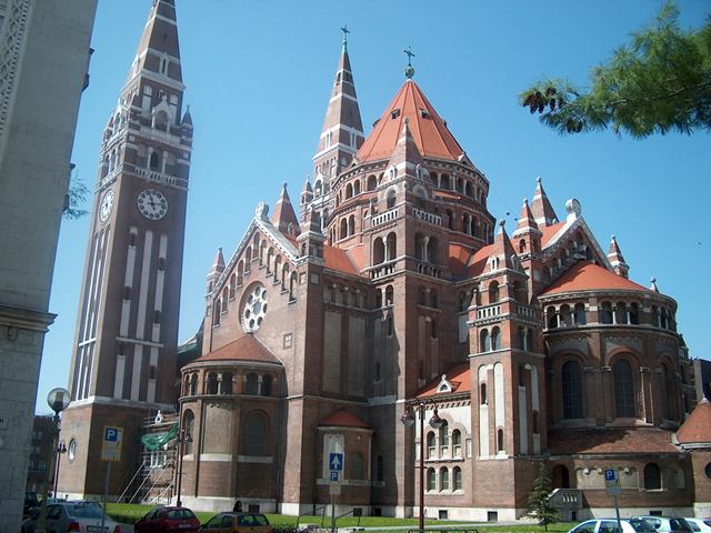 Építéséről a városatyák 1890-ban határoztak, az újabb árvizektől való menekülésért fogadalomból. Helyét a régi Demeter templomnál jelölték ki, melynek első terveit Schulek Frigyes, a Budai Halászbástya tervezője készítette, aki fehér kőből akarta megépíttetni a templomot. Az égbeszökő költségek miatt Foerk Ernőt bízták meg a tervek módosításával, aki a fehér kő helyett lombardiai téglát javasolt. Az 1913-ban megkezdett építkezést hamar félbeszakította a háború, és csak 1923-ban kezdtek újra neki. A dóm falain látható, 1914-ben hol maradt abba az építkezés: a háború után beépített vörös téglák színárnyalata némiképp különbözik a többitől. De ennél szembetűnőbb jel is akad: a templom tornyain körbefutó párkányokon, fehér kőbe vésve olvashatjuk Vörösmarty Mihály Szózatának szavait: "Az nem lehet, hogy annyi szív hiába onta vért". A felirat helye mutatja, milyen magasak voltak a falak az első nagy világégés előtt. Az építkezés ez után elfogadható ütemben haladt. 1930. október 24-én fel is szentelték hazánk negyedik legnagyobb templomát, mely ötezer hívő befogadására képes. Az ünnepi misére Dohnányi Ernő komponált zenét. A Dóm alaprajza szabályos latin kereszt. Hossza kívül 81, belül 66 m, szélessége kívül 51, belül 48 m. Tornyainak magassága a Tisza 0 pontja fölött 91 m, a templom padozatától számítva 81 m. A kupola magassága kívül 53,60 m, belül a padlószinttől 33,40 m. A főhajó és a kereszthajó egyaránt 14.50 m széles és 20,70 m magas. A főbejárat középső kapuja előtt sátorszerű emelvény áll, tartóoszlopai oroszlánokon nyugszanak. A sátortetőt, a kapubélletet mértani és növényi díszítmények borítják, közöttük gótikus fejek bújnak meg. A homlokzat középpontjában a templom védőszentjének, a Magyarok Nagyasszonyának szobra áll. Mellette kétoldalt a magyar szentek (István, László, Gellért, Kapisztrán) csoportja. A homlokzaton végigfutó mozaikképek a tizenkét apostolt ábrázolják. (kiskép - dóm díszei1) Az alkotó művészek (Márton Ferenc, Zsellér Imre) az apostolokat fél alakként, felül körívben záródó képmezőben ábrázolták. Bertalan, Fülöp, Máté, András, Judás, Tádé, Péter, Pál, arcmása, jobb profilban Simon, Id. Jakab, Ifj. Jakab, János, Tamás. A képmezők kettes hármas csoportokban vannak elrendezve. A mozaikképet 1991-ben restaurálták. A nyugati torony falán, elöl helyezték el fehér mészkő keretben az 5. honvéd gyalogezred hősi halottainak emlékét megörökítő bronz domborművet. A Dóm nyugati homlokzatán helyezték el 1944-ben, a Szent Antal kút domborművet (kiskép - dóm díszei2). Az építészeti részt Sebestyén Endre tervezte, a dombormű Erdey Dezső alkotása, ruskicai márvány, teljes magassága 7 m. Szent Antal figurája gótikus kiképzésű toronysisakos fülképe került. A szerzetesi öltözetben ábrázolt szent kezében halat tart, a halaknak prédikál. A díszkút - bár elkészült hozzá a keretes medence - soha sem működött. A Fogadalmi templom sekrestye nyugati homlokzatán, az ablakok alatt vízszintesen, mellvédszerűen egymás mellett, három különálló, de témájában összefüggő, Virágh Márk mészkő dombormű (kiskép - dóm díszei3) a szentségek bemutatását ábrázolja. A Fogadalmi templomban van, Európa harmadik legnagyobb ötmanuálos orgonája amely 9040 síppal rendelkezik, ahol a legnagyobb 5 méter hosszú, a legkisebb pedig csupán másfél centiméter. A templom összesen 5 haranggal büszkélkedhet, melyek közül 250 kilogrammot nyom a legkönnyebb (lélekharang), a legnehezebb (Hősök harangja) 8600 kilogramm súlyával Magyarország második legnagyobb harangja (átmérője 2,3 méter). Magyarország legnagyobb számlapjával (4,3 méter) büszkélkedhet a Fogadalomi templom órája. A két mutató mérete is ritkaságszámba megy, pontosan 2,7 és 2,3 méter hosszúak. A Dómot kívül és belül is mozaikok, szobrok, domborművek sokasága díszíti. A háromhajós templom legfőbb dísze a baldachinos főoltár, mely nemes, fehér márványokból készült. A szentély mennyezeti mozaikján Szűz Mária megkoronázása látható: a kép érdekessége, hogy Máriát szegedi piros papucsba, és alföldi szűrbe öltöztette a művész. A főoltár mögötti üvegablakok képeit Róth Miksa festette. A dóm legjelesebb művészi alkotását a kereszthajó bal oldalán, a Szent Gellért-oltár közelében találjuk. Fadrusz János Krisztus a keresztfán című szobra - mely az 1900-as Párizsi világkiállításon fődíjat nyert -, úgy készült, hogy a művész önmagát kötöztette keresztre, s az így készült fényképek alapján mintázta meg a szenvedő Jézust.