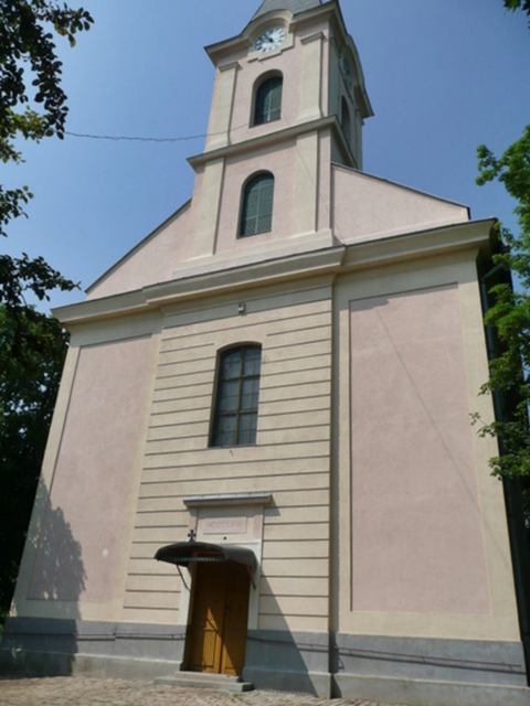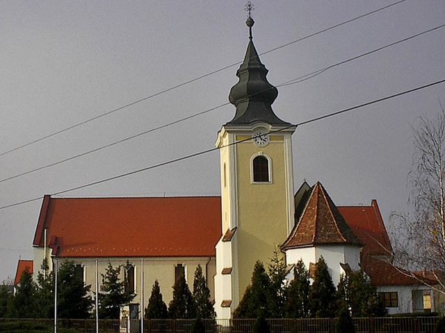 A település első templomát 1138-ban említik. 1526-ban a Budáról visszavonuló török seregek fölégették. Az erősen átépített középkori templomból csak a szentély és a torony alsó része maradt fönn. A szentély a nyolcszög öt oldalával záródó alaprajzú, két négyszakaszos támpillérrel, belül bordás boltozattal. Szélessége a diadalív mellett mérve 3,65 méter. A torony fölső része és a toronysisak barokk kori. A szentélybelsőben talán még középkori freskó nyomai találhatók. A múlt század végén a freskókat lemeszelték, 1939 Szentiványi Gyula tárta föl és restaurálta azokat. 1770 és 1779-ben barokk stílusban építették át. A jelenlegi állapot az 1940-es évek eleji átépítés eredménye - Csányi Károly tervei szerint. Ő adományozta a templomnak a ma látható román kori lombardiai keresztelő medence másolatát. A templom tájolását megváltoztatva a középkori szentély és a hajó ekkor lett az új templom kereszthajója. A jelenlegi templom búcsúnapja Mihály arkangyal ünnepe, ami talán arra utal, hogy a középkori templom patrocíniuma Szent Mihályhoz kapcsolódott.