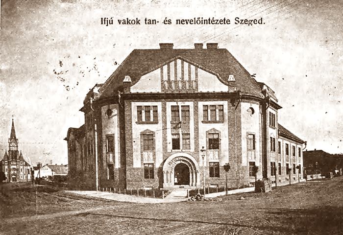 1901-ben nyílt meg Klúg Péter munkájának eredményeként a Siketnémák Intézete Szegeden, amely a következő évtől a vakok oktatásával is foglalkozott. Kezdetben tízen kaptak munkalehetőséget. Számuk három év alatt 37 főre emelkedett; ekkor, 1905-ben megalapították a vakok külön intézetét. Az egyúttal létrejött Vakokat Gyámolító Egyesület vállalta az intézet bővítését egyrészt adakozással, másrészt a vakok készítette iparcikkek eladásával. Fő foglalatosságuk a fűzfavessző fonása volt; a Város 1907-ben 10 hold füzest adott át nekik ingyenes használatra. Intézetük elhelyezésére már 1910-ben, szintén ingyen rendelkezésükre bocsátott a Város három összefüggő telket, ahol épületüket Hajós Alfréd és Villányi János tervei alapján Fónagy Béla irányításával felépítette az állam. Ekkor költözhettek végleges otthonukba a Tisza Lajos körúti bérelt házukból. Kiderült, hogy meglehetősen hideg és huzatos helyet kaptak. Itt olvasta fel Karácsonyi üdvözlet a világtalanoknak, másként Betlehemi üzenet a vakoknak c. versét Juhász Gyula 1918-ban. Az évben Újszegedre érkezett a szerb királyi hadsereg egy harmincfős osztaga; és itt szállásolta be magát. 1919-ben hadizsákmány-bizottságuk vezetésével alaposan megdézsmálták a berendezést, más rablott javakkal egybegyűjtve vagonokban elszállították. S bár a trianoni békediktátum Újszegedet Csonka-Magyarországhoz tartozónak ítélte, a szerbek határkapitánya "véglegesen" berendezkedett az épületben, szerencsére mindössze 1921-ig. 1953-ban légoltalmi óvóhelyet alakítottak ki pincéjében, a tüzelőanyag-raktár helyén 150 fő részére. Francz Rezső tervei szerint sűrű pillérállással és vasbetongerendákkal erősítették meg a szélesebb traktus födémét. Két utcára néző, tagolt homlokzatképzésű épület, amely a nagy rálátásnál fogva meghatározó szerepű az újszegedi hídfőben. Átló lesarkítással keletkezett sarki tömege két-, oldalsó szárnyai egyemeletesek. A felső szinti kupolás nagyterme eredetileg kápolnának készült, később kultúrteremként használták. Homlokzatképzésére egyszerű formai elemek mértéktartó használata jellemző. Téglaburkolatot kapott széles sávban az épület lábazata, a főpárkány, ezeket függőleges sávokkal kötötték össze, változatos nyíláskeretezésekkel kiegészítve. Égetett cserép a határozott és hangsúlyos lezárást adó magas tető héjalása is. A sarki tömeget már az utcák irányába befordulva egy-egy kétszintes attikával koronázott rizalit keretezi. Magas orommező emeli a főtengely méltóságát; bejárata a román bélletes kapukat idézi, de sajátságosan eredeti részletképzéssel s ívében "Vakok Intézete" felirattal. A két oldalsó szárny nem egyforma kialakítást kapott, a tér felé nézőt kis orommező alá fogott félköríves emeleti ablakok teszik lágyabbá. Hiányoznak a rakpart felőli oldal érdekes tetőablakai és a tető csúcsdíszei.