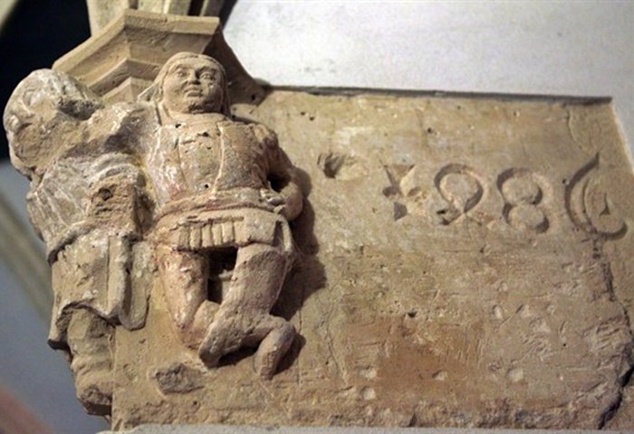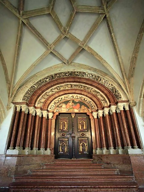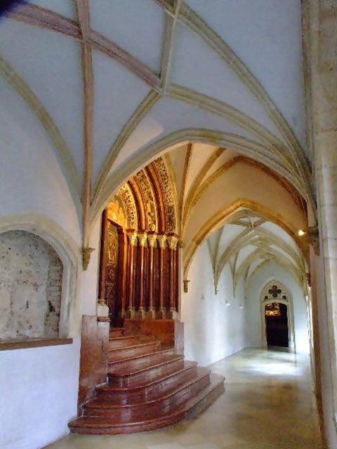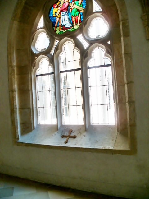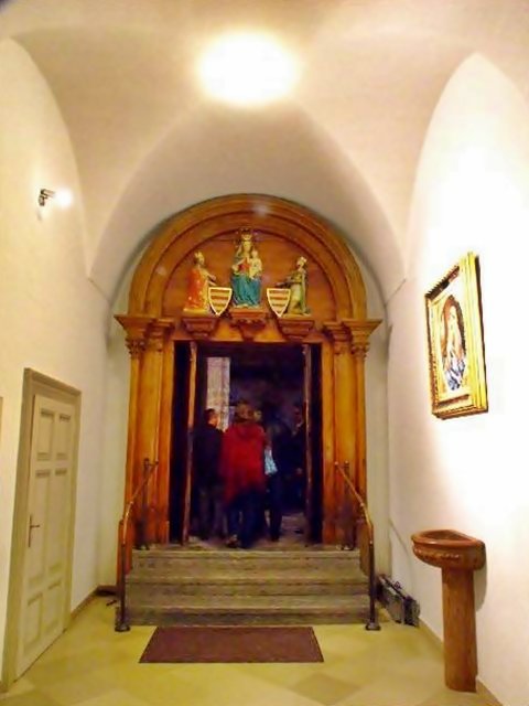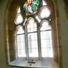 kerengő falfülkével - gyámkő évszámmal - kerengőablak - Szent István kápolna bejárat és üvegablak