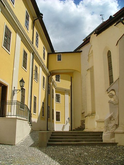 A látogató központból a domboldalban kialakított lépcsősoron már az idegenvezetőnkkel (fiatal végzős diák) együtt sétáltunk fel az apátság épületegyütteséhez. Az épületegyüttes nem minden része látogatható, akad, ahová csak a bencések léphetnek be. Ott végső soron minden azt szolgálja, hogy az a szerzetesi életforma, amely - Szent Benedek nyomán - másfél évezrede fennáll, továbbra is a csendből és az imádságból táplálkozhasson, a szerzetes pedig egyre inkább önmagává és az emberek testvérévé váljon. Először tehát belépünk az apátság eredeti, nagy öntöttvas kapuján át - melyen látható a pannonhalmi apátság címere is, az első nagy udvarba és végigsétáltunk a Pannonhalmi Bencés Gimnázium és Kollégium épületei között. A leendő rendtagok képzését szolgáló iskola az Apátság megalakításának kezdeteitől működött itt. II. József 1786-ban beszüntette a magyar bencés kongregáció összes házának működését. Világi képzésre először 1921-ben került sor. A gimnázium és kollégium jelenlegi klasszicista stílusú épületeinek építése 1939-ben kezdődött, az elkészült épületekben pedig először "olasz" gimnázium működött. Az iskolát 1948-ban államosították, majd 1950-ben bencés gimnáziumként újra indulhatott, melybe kizárólag fiúk nevelése folyik. A következő épületben található a főapát, Várszegi Asztrik szobája, amelynek erkélyéről II. János Pál pápa köszöntötte a magyar népet magyarországi látogatása során. A gimnázium újkorban emelt tömbje és a barokk kolostor között haladva, korban is egyre tovább két emlékmű utal első királyunkra: Asztrik apát szobra (ő hozta a koronát) és egy kő dombormű.