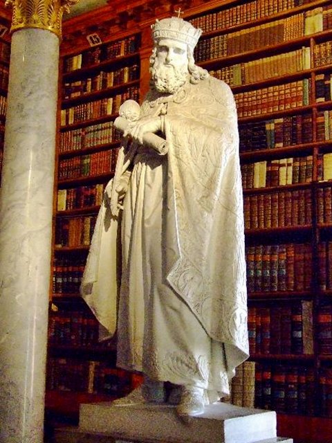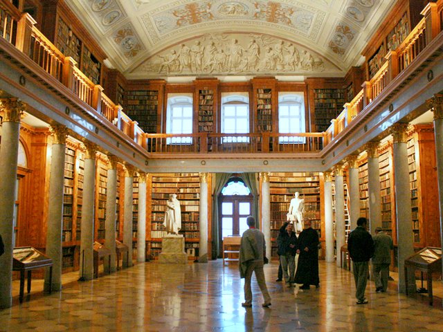 Az apátság évszázadokon át szellemi központ volt, hihetetlenül nagy, felhalmozott kulturális értékekkel. Ennek központja a 19. században a toronnyal harmonizáló, klasszicista homlokzatú épületben helyet kapott levél-, könyv-, képtár együttes. A hatalmas méretű empire stílusú könyvtártermet 36 márványozott jón faoszlop futja körbe. Ezek tartják a faragott karzatot, míg a falat 150 faragott cseresznyefa szekrény takarja. Kelet-nyugati tájolású, hosszanti elrendezésű, hossz és keresztszárnyból álló négyszintes épület három rizalitra osztott homlokzattal. Nyugat felől a középső rizalit masszív alapépítményének falát három kis méretű félkörös ablak töri át. A középrizalit efölött kéttengelyes. A nagy ablakokkal és vakablakokkal tagolt felső szintjeit ion pilasztereken nyugvó szobordíszes timpanon zárja le. A timpanonban a tudományt és művészeteket megszemélyesítő allegorikus szoborcsoport. Az oldalrizolitok egytengelyesek. A hosszanti szárny keleti végéhez kapcsolódó keresztszárny keleti és déli fala a monostor épületeihez ízesül. Belső terei szintenként eltérő osztásúak. Az alépítményben rejlő, a hosszanti szárny alapterületével egyező, négyhajós, pilléres, csehsüveg boltozatos csarnok jelenleg kiállítótér. Fölötte az épület teljes alapterületével egyező tér könyvraktár. Efölött az épület közepén húzódó két színt magasságú nagyterem közvetlen megvilágítását a homlokfal négy ablakán keresztül kapja. Könyves szekrényekkel fedett falai mellett korinthoszi oszlopok által hordozott erkély fut körbe. A hosszanti teremhez kelet felől tágas félkörívvel kapcsolódó keresztszárny felépítse hasonló a hosszanti teremhez. Két fázisban épült 1824 és 1827 illetve 1833 és 1835 között. Első építésze Joseph Franz Engel. 1827-ben bekövetkezett haláláig azonban csak a középkori erődfal északnyugati saroktornyának helyén emelt könyvtár készült el. Az épület első változatában csupán a hosszanti nagyteremből és az azt kísérő földszinti mellékterekből állt.