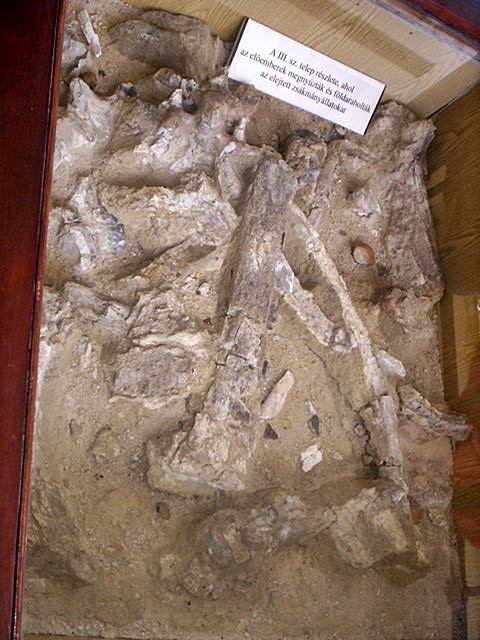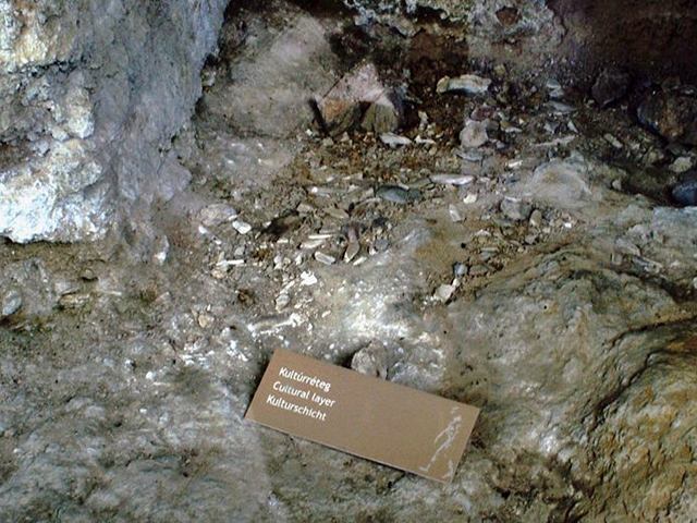 Az előember telepei helyenként 20-25 cm vastag, máshol sokkal vékonyabb, "szabályszerű" hulladékrétegből állnak. Jókora területen, rendkívül sűrűn, vastagon fekvő összetört állatcsontokból, fehérek, krétásak; máshol barnább, helyenként fekete kis foltokban. Az ember törte fel őket a velő miatt. A rengeteg csontszilánk szinte szőnyegszerűen ottmaradt, összecementálódott, és lassan beágyazódott a mészkőbe vagy a mésziszapba. Helyenként, elég sűrűn, erősen átégett kis tűzhelyfoltok maradtak. Nyilvánvaló, hogy ezeket a tüzelési helyeket nem egyszerre, hanem különböző időszakokban használták.