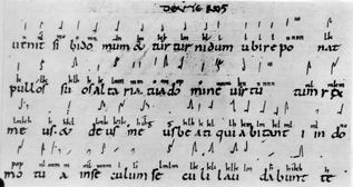 Szótagokkal írt notáció. Tanítási célra készült könyvekben alkalmazták. Tonárium-részlet 1045-ből. (Bibl. Apostolica Vaticana) A notáció kialakulását, az elmúlt évszázadok alatt megtett útját figyelembe véve és a betűírással összevetve, a zene írásban három rendkívül eltérő hosszúságú szakaszt figyelhetünk meg. Az első időszak a 9. századig tartott, amikor a notáció a fejlődés útját tekintve végigjárta azokat a fázisokat, amelyeket az írás a betűírás kialakulásáig megtett. A második igen rövid periódus a gótikus hangjegyírás alkalmazásának időszaka (10. - 11. sz.), amikor a notáció és betűírás - bár kizárólag a formai jegyeket tekintve - együtt fejlődött.