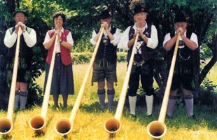 A fenti vokális formáknak hangszeres változatai is fennmaradtak, napjainkban is hallhatók, ritkábban fakürtökön, fatrombitákon, vagy állat szarvából készült kürtökön, gyakrabban a régió specifikus hangszerén, az alpesi kürtön. Az ALPESI KÜRT (Alpenhorn), az Alpokban (alpesi, osztrák, svájci) élő pásztor közösségek fafúvós hangszere. Nagy valószínűséggel kelta eredetű, Svájccal összefüggésben az 1550-es években említik először a történeti források. Mérete 120 cm és 325 cm közötti (Svájcban 185 cm körüli a leggyakoribb, de Ausztriában is előfordul). A vokális jodelhoz hasonlóan a kommunikáció eszköze, leginkább a lábasjószág terelésében játszott szerepet, de bizonyos területeken a templomba vagy háborúba is az alpesi kürtök hangja hívta az embereket. hangjain.