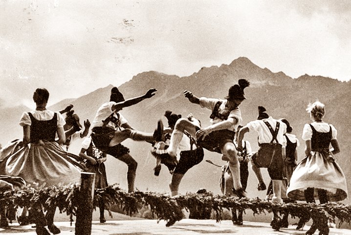 Az OSZTRÁK népzene (Svájchoz hasonlóan) valójában az alpesi területek pásztorkultúrájának zenéje. A műfajok többsége az állattartással, tereléssel, legeltetéssel kapcsolatos valamely szerepben jelenik meg, ennek az erős funkcióhoz kötöttségnek köszönheti túl- és továbbélését. Ezek az összetett hívójelzések (Almschrei) - az alpesi áldás (Alpsegen), a jódlizás (JODLER), és a pásztorok régi éneke (Kühreigen). Ezen formák mindegyike akusztikus kommunikációra szolgál, akár emberek között, akár emberek és állatok között, illetve emberek és felsőbb erők között. Az ALMSCHREI különböző hívójelzések összessége, részint a lábasjószág összeterelésére, részint az emberek munkába hívására szolgál. Az alpesi áldás (ALPSEGEN) a pásztorok régi mágikus kultúrájával hozható összefüggésbe, zsoltárhoz hasonlítható ima, Szűz Máriától és egyéni védőszentektől kér oltalmat. A JÓDLIZÁS (osztrák JODLER - svájci JODEL), az alpesi területek speciális kommunikációs technikáját alkalmazza. Szavak nélküli éneklés, amiben a hangszínnel való játék hangsúlyozott szereppel bír, amit a mell- és fejhangok (falzett) közti folyamatos regiszterváltás különleges technikájával ér el az énekes. Szerkezete kötetlen, modorában valahol az ének és a beszéd határmezsgyéjén mozog. A hangok nagy hangközlépésekben követik egymást, hangterjedelme kifejezetten nagy (képzettebb énekeseknél 3 oktáv). Az emberek közti érintkezésben volt kiemelt szerepe, különleges technikájának köszönhetően igen nagy távolságokra is elhallatszik. Hagyománya ma már csak Tirol egyes területein él. Ezen kívül a SVÁJCBAN használt lírai dalok többsége egyszólamú, kivételt a nyugati területek képeznek (néhány népdal kórusos refrénnel jelenik meg), illetve bizonyos, a keresztény ünnepkörrel kapcsolatos dalok, amelyek a gyakorlatban terc- és szext párhuzamos mozgásban (ritkábban szabadon improvizált) maradtak fenn. Tematikájukban javarészt a hittel és a népi szokásrenddel kapcsolatosak. Többségük 19. századi eredetű (karácsonyi és vízkereszti népénekek, májusdalok, fonódalok, gyermekdalok, játékdalok, patrióta dalok és szerelmes dalok), néhány gyermekdal, bölcsődal, vallásos ének és ballada keletkezett csak korábban. A nép körében terjedtek egyértelműen nem autentikus népi stílusú dalok is (Schweizerlieder). A francia forradalmat követő hazafias szellem tömegével ontotta a népies patrióta dalokat, terjesztésükben a frissen alakult, leginkább diáktársaságok tevékeny részt vállaltak.